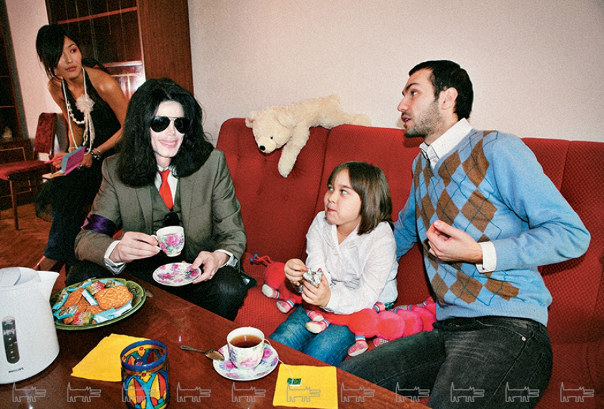 12.30. Едем по городу к Светлане Петровне домой. «Look! Real Big Ben!» – тычет в стекло Майкл. Вадим Сергеевич объясняет, что это лингвистический центр, который построили пять лет назад. Улица Мелик-Карамова, панельный дом, на крыльце нас встречают Светлана Петровна с Аней. На журнальный столик ставят чашки и заваривают чай из пакетиков – другого в доме не оказывается. Аня ест печенье и смотрит на Джексона с интересом. «This is white bear, Anya, his name is Dima. It’s yours!» – Майкл дарит Ане плюшевого мишку, которого Чжань утром купила тут же в магазине. Майкл интересуется, что Аня изучает в школе, какие предметы ей нравятся и любит ли она рисовать. Аня стесняется и на многие вопросы только улыбается, потом рисует карандашами портрет Майкла – очки, пиджак, черные волосы – и дарит ему, написав на оборотной стороне «Лублу тебя».
